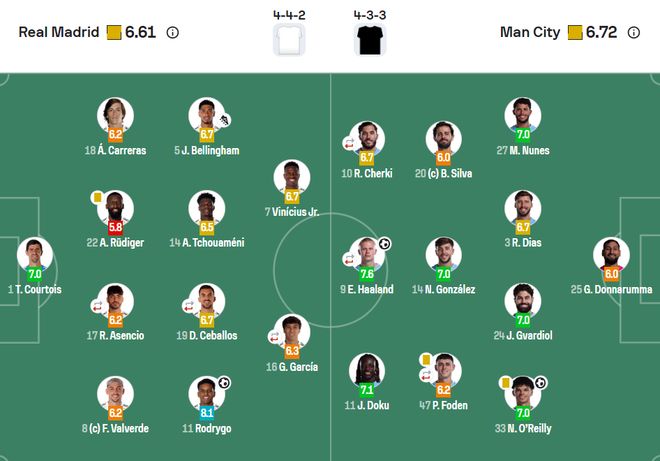 曼城2-1皇马,球员评分出炉:不是哈兰德获第一,最差之人无争议